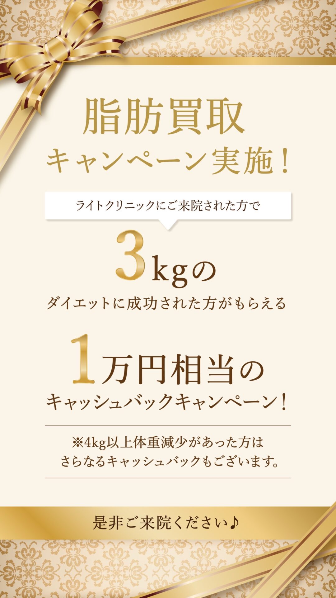 脂肪買い取りキャンペーン 脂肪買取キャンペーン開始 4月は新生活や新学期など新しいことを始めるのにぴったりな季節です。 そこで、4月よりダイエットコースをご契約の方に、1ヶ月で3Kg以上減量できた場合1万円のキャッシュバックキャンペーンを開始します。 3Kg以上減量できた場合は1万円以上のキャッシュバックもございます。 詳細はクリニックまでお問合せお待ちしております。