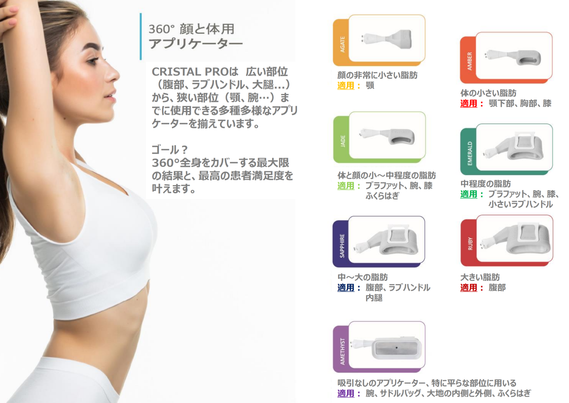 脂肪冷却治療(クリスタルプロ)は、切らずに脂肪除去が行えるマシン治療です。長いダウンタイムがなく、リスクが少ないのが特徴です。脂肪細胞を0℃以下の温度で冷却し、破壊、死滅した脂肪細胞を老廃物として体外に排出します。脂肪細胞が減少することで効果的な部分痩せを実現することができ、一度死滅した細胞は増えないため、比較的長い期間効果の持続が期待できます。